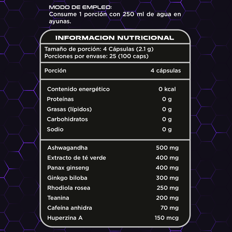 Consume una porción (4 cápsulas) en ayunas o con mínimo 3 horas de no haber comido nada. Si eres muy sensible a la cafeína inicia por 3 cápsulas y ve subiendo la dosis dependiendo de tu tolerancia. Puedes aumentar la dosis a hasta 6 cápsulas al día. En el caso de ser un consumidor regular de café sería recomendable que hicieras un detox de cafeína.